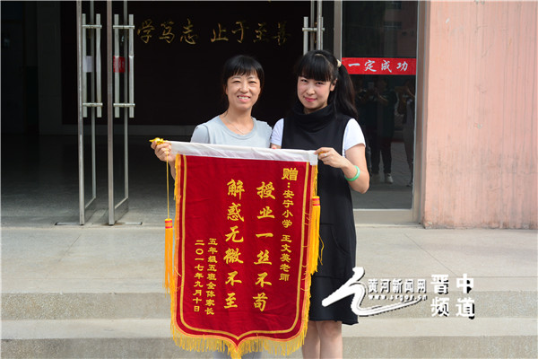 黄河新闻网晋中频道讯 9月8日,在第33个教师节来临之际,晋中市榆次区安宁小学的曹景芳、王文英、韩建国三位老师收到一份特殊礼物--来自五年级(5)班全体家长送来的锦旗。以此方式感谢学校对孩子的培养,也感谢老师们的悉心教导。