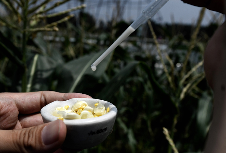 北京市农业技术推广站农艺师提取玉米汁,准备检测含糖量。