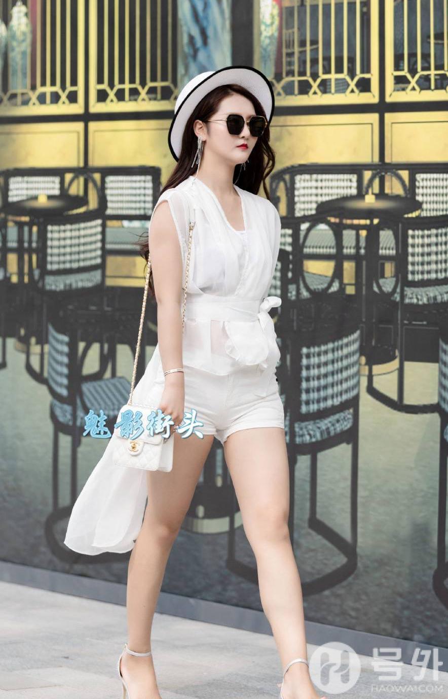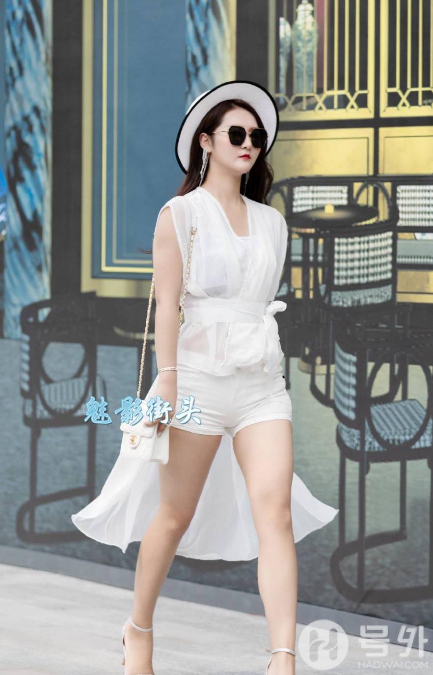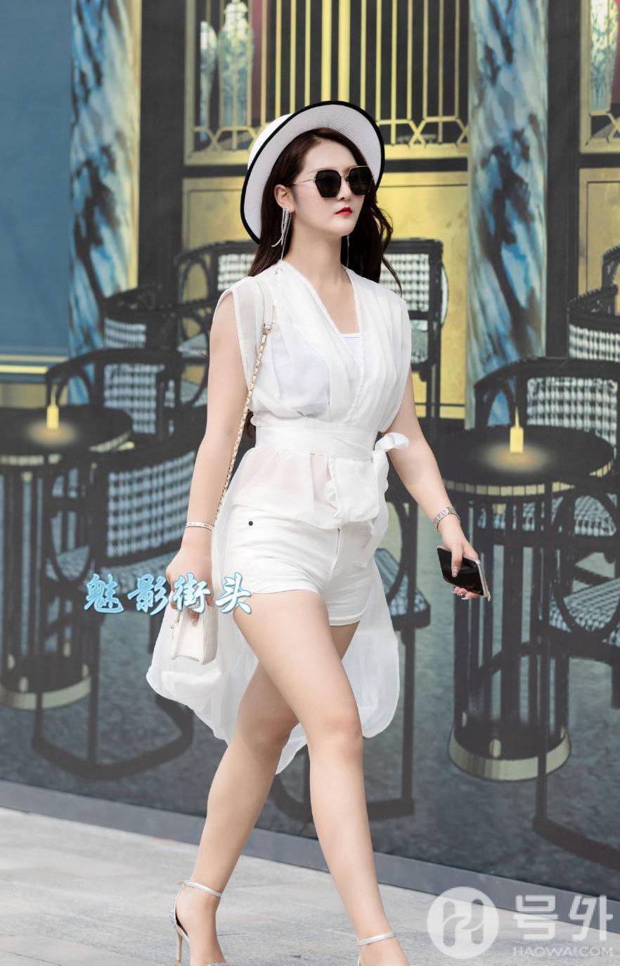 这位美女身材微胖、皮肤白嫩,头上戴着一顶白色圆帽和一副时尚的太阳镜,美女出街是做足的防晒工作。美女上身穿了一件带着长长的披风款式的白色无袖上衣,身V领加腰带设计凸显了美女曼妙的身姿。下身穿一条白色牛仔短裤,搭配一双白色一字带高跟凉鞋,这款鞋子是一款特别性感、特别有女人味的鞋子,无论怎么搭配都好看,最大的优点就是凸显美腿颀长的效果非常棒。美女全身白色系的搭配展现了清透纯美的淑女气质,同时也穿出了微胖美。
