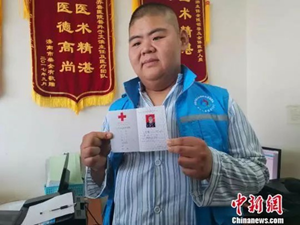 王浩楠已经成为中国红十字会志愿者,经常参加各种公益活动,科普肥胖危害、分享减肥经验,希望通过这种方式帮助更多“胖友”瘦身成功,拥有健康身体。图为王浩楠和他的志愿者证。郝学娟 摄