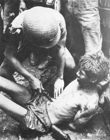下面这一组老照片就真实记录了当时南越士兵虐待越共战俘的情景。再看上面这张老照片,这不是天主教的洗礼仪式,而是将战俘头部扎进淤泥水塘里,不让你死,就是要慢慢折磨你而已。