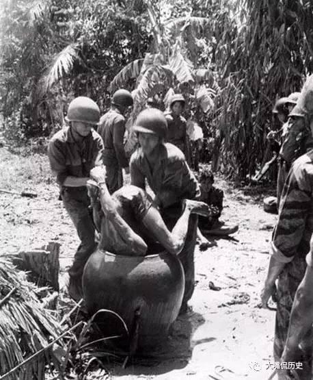 再看下面这张照片,南越士兵将一名北越战俘扔进缸里羞辱。