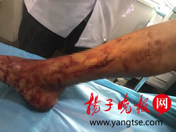 老人送医时,浑身充满着刺鼻的气味,包扎的衣物上满是血迹,同时精神萎靡,仍处于受惊吓的状态。扬中人医急诊外科医生汤勇,稍事检查后,立即剪开老人裤腿,发现老人右腿伤痕累累,大腿、膝盖、小腿、足背、脚趾等处,大大小小的10多处伤口仍然在不停地出血,当即判定老人的外伤属于Ⅲ暴露伤口。