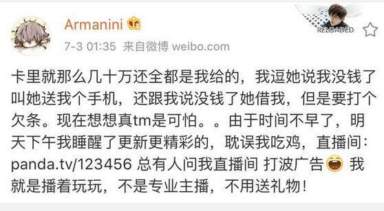 王思聪好兄弟,之前熊猫TV主管A总armanini微博手撕陈海沛了,陈海沛之前是川航空姐,后来参加《hello女神》跟A总认识,A总跟陈海沛在一 起这半年多时间在陈海沛身上砸了好几十万,结果陈海沛背着A总聊小狼狗,被A总发现的就有两个。