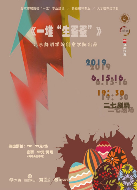 北京舞蹈学院是中国舞蹈爱好者向往的最高殿堂,培养了众多舞蹈艺术家,为我文化艺术事业输送了许多优秀人才,被誉为“舞蹈家摇篮”。《一堆“生蛋蛋”》是北京舞蹈学院创意学院为学生自主创作作品而搭建的教学实践平台,用于展演由创意学院的同学们以创作实践为目的共同创造的舞台系列节目。今年,北京舞蹈学院创意学院毕业作品展演《一堆“生蛋蛋”》即将于6月15日、16日分两场在二七剧场上演。