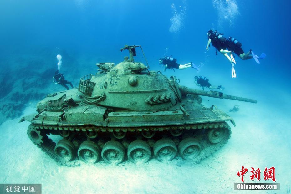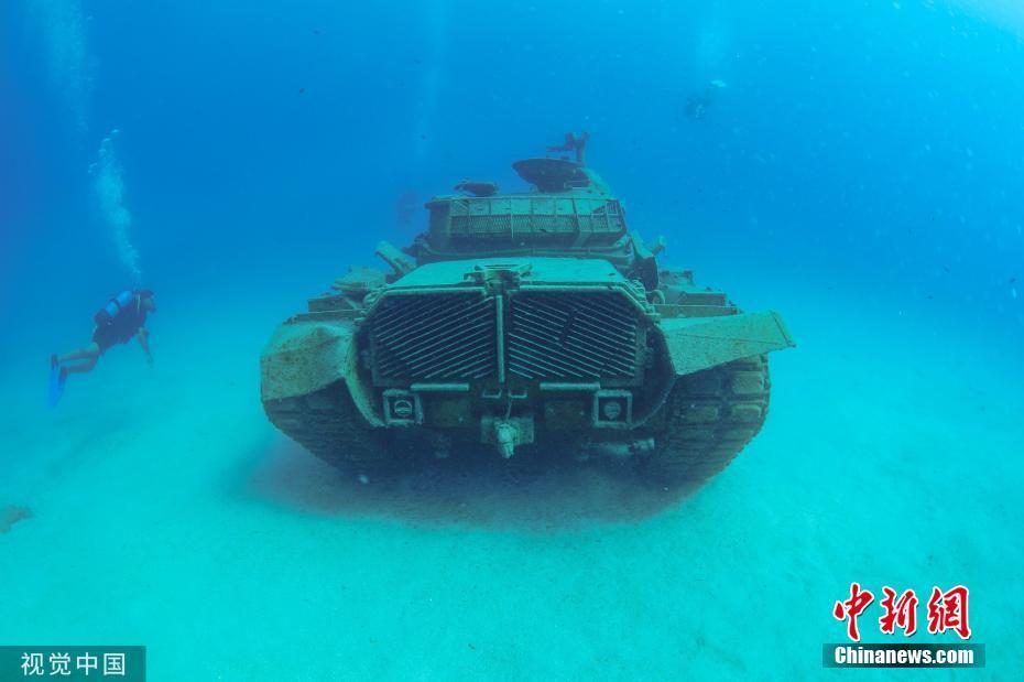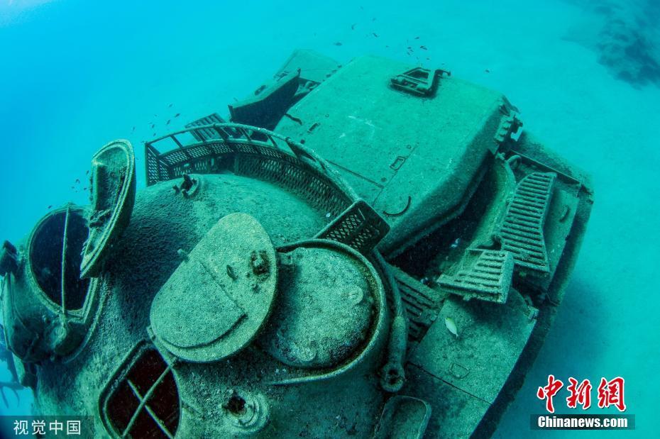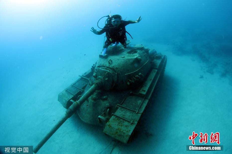当地时间9月22日,土耳其安塔利亚,潜水员在地中海沿岸一海滨度假胜地潜水,探索被安放在水下20米深处的1960年产旧坦克。
