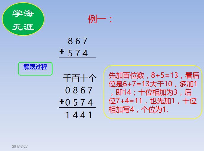 竖式加法速算,从左至右计算,算前看后,提前进位,答案一次写出。先从高位计算,后一位相加大于等于10,则先进位;特别留意的是,和为9时,要再看下一位,如果大于等于10,一定要先进位。
