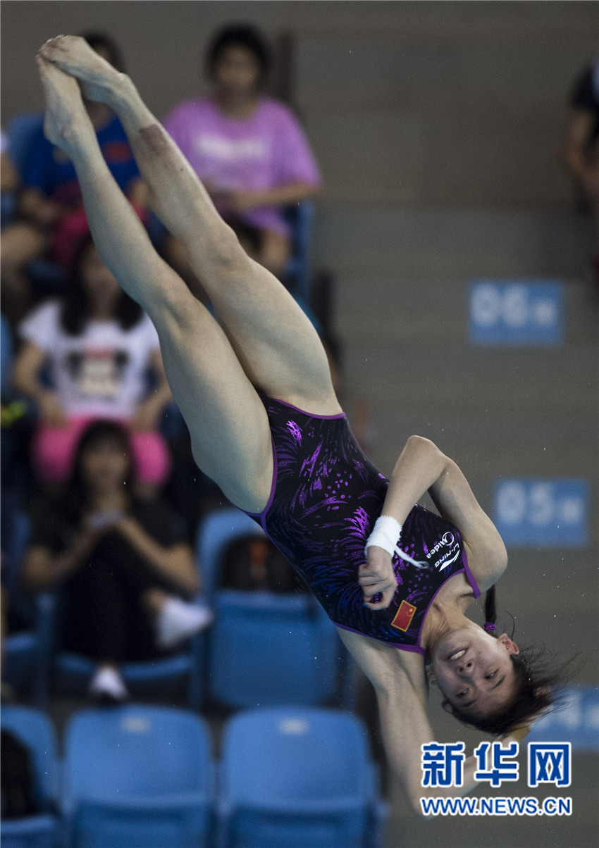 5月16日,在湖北武汉举行的2017年全国跳水冠军赛暨第十三届全运会预选赛男女混合全能决赛中,北京水立方队选手王安琦/连婕组合以413.10分的成绩获得冠军,天津队选手陈叶源/朱勇鑫组合以391.60分的成绩获得亚军。在女子三米跳板决赛中,重庆队选手施廷懋以404.55分的成绩获得冠军。新华社记者肖艺九摄