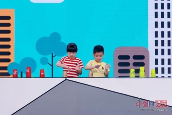 "番茄炒蛋"组合小小年纪,已经携手走过大大小小的比赛。"番茄"张瑜庭是世界女子叠杯333和363的记录保持者,"炒蛋"谢升甫是世界叠杯团体赛和双人赛的记录保持者。两人现场演示神奇叠杯技能,配合默契收放自如,一眨眼已经完成,手速之快,令人咋舌。