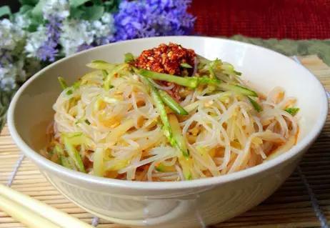 7、粉丝沥干水分后,拌入黄瓜丝。