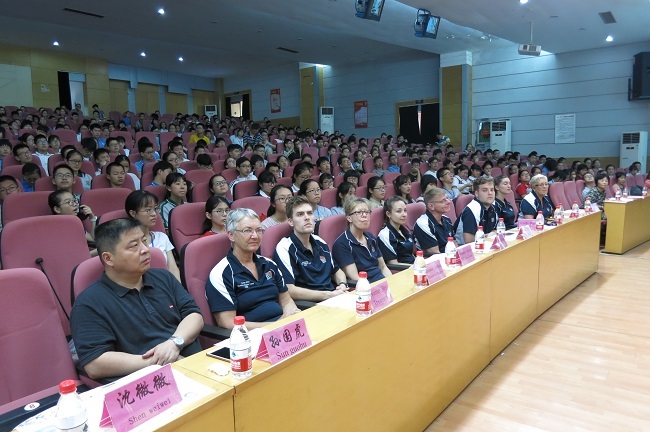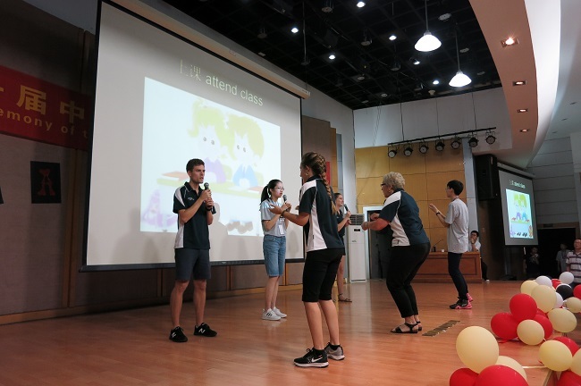 澳大利亚老师的领队雪柔女士也发表了热情洋溢的讲话。她说,2017年中澳英语夏令营对每个澳大利亚的老师来说,是一次非常精彩的经历。这是一次我们和一中的老师、同学们一起教、一起学、共同交流思想、建立友谊的双赢的机会。在教学过程中,我们向同学们分享了在澳洲生活的信息,我们的课程鼓励同学们建立自信、提升用英语交际的能力,通过游戏和活动,重视同学们听说唱的练习。我们开设了关于自然环境、工作运行、艺术、旅游、购物、食品以及在沙漠孤岛求生等课程;我们品尝了澳洲臭豆腐、闻了产于澳大利亚橡胶树的桉树油。雪柔女士对同学们在学习中取得的进步和精彩的表现感到非常自豪和由衷的高兴,同时感谢助教的热情帮助,使他们的教学工作能顺利完成。雪柔女士最后再次用中文祝愿我们友谊天长地久!