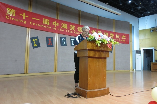 雪柔女士等9位外教、校长孙国虎先生、副书记骆青先生、副校长朱玲女士和全体营员出席了仪式,副校长朱玲女士主持了闭营仪式。
