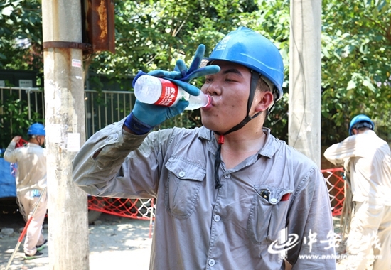 经过20多分钟的紧张抢修,故障排除,从发生故障到恢复送电,过去了仅仅50分钟。随着楼宇间空调启动的声音不断响起,一户户居民家中又恢复了清凉与舒适,而登杆作业的陈兴与程龙飞早已满脸通红,下杆回来,拿下安全帽,湿透的头发紧贴额头,衣服紧紧吸在身上。接过热心居民递来的矿泉水,两人像比赛一样,一口气灌了下去。