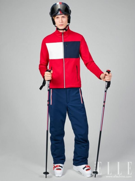 TOMMY X ROSSIGNOL套装系列,由男式运动休闲系列套装与滑雪装备组成,包括有衬垫的滑雪夹克,滑雪俯冲羊毛衫,滑雪裤、雪地靴、雪仗以及滑雪头盔。