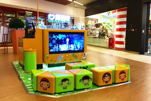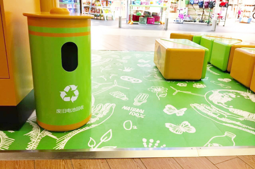 爱回收嘉里中心全新升级的环保服务站抛开固有"数码产品回收"的印象,从社会责任与品牌形象的角度展示爱回收的服务与理念。为了增加与儿童之间的互动体验,爱回收将店面近三分之一的区域设计为休息区,采用积木设计的卡通风儿童座椅和垫子,并配以电视荧幕播放儿童喜爱的节目。爱回收一方面希望孩子可以在商场内拥有一个固定的休闲区域,也喜欢借由孩子休闲娱乐的同时,通过绿色电池回收桶引导儿童回收废旧电池,从小培养环保意识。