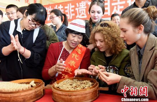 中新网呼和浩特3月31日电 (张瑾娴曹艺)31日上午,呼和浩特全城非遗体验第二站走进内蒙古师范大学,该校中外师生共同体验和学习了和林格尔面塑、归绥传统面点、莜面饮食、青城德兴源烧麦等传统面食的制作技艺。