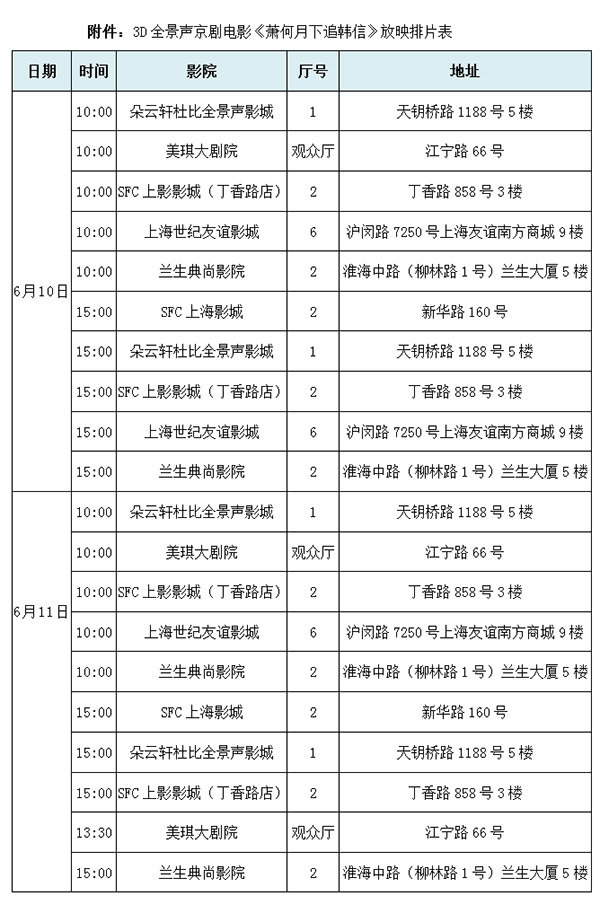6月10日,正值"文化和自然遗产日"。上海市非物质文化遗产保护中心、上海京剧院、上海广播电视台、上海电影(集团)有限公司和上海艺术电影联盟五家单位携手,于6月10日、11日推出3D全景声京剧电影《萧何月下追韩信》主题展映活动。市民可以在SFC上影影城、朵云轩杜比全景声影城、兰生典尚影院、美琪大剧院、SFC上影影城(丁香路店)、上海世纪友谊影城等影院欣赏到这部全新的作品。