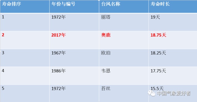 从7月21日8时命名,至8月9日凌晨2时停编,奥鹿在海洋与日本陆地总共存活了18天又18个小时。别看这个数字于人类而言不过是沧海一粟,要知道,台风的平均寿命约为5天4个小时。奥鹿的寿命为平均值的3倍之多,以此对照人类,它早已是260多岁的长寿老妖精了。因此,依照数字台风网以热带风暴以上强度的累计时间为标准,奥鹿名正言顺地超越1967年台风欧珀,晋升有史以来第二长寿,仅次于1972年台风丽塔。