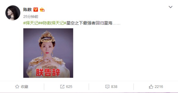 网易娱乐6月1日报道 昨晚,由鹿晗、古力娜扎主演、陈数特别出演的古装玄幻大剧《择天记》高潮迭起,好戏不断。长生身世真相大白,陈数饰演的天海圣后惨遭刺杀魂归星海,正式收官。就在观众大呼"长生母子太虐了"、"还我长生妈妈"时,陈数却在微博po出圣后表情包,称"朕告辞",引得网友大呼有趣,调侃圣后就连收官都那么会玩。
