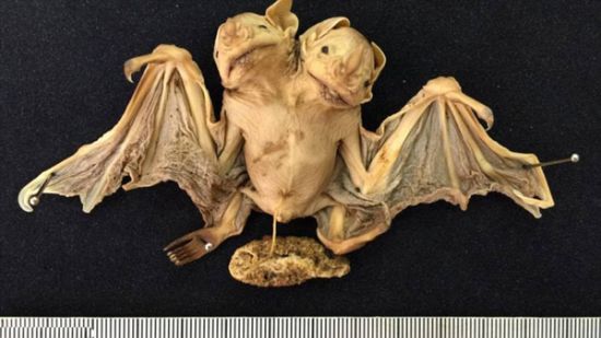 据英国《每日邮报》8月2日报道,2001年,研究人员在巴西东南部的一棵芒果树下发现了一例联体双头蝙蝠。被发现时,其两头并排,躯干连为一体,尸体上仍有脐带和胎盘附着,可断定为新生儿。超声波分析显示,这只蝙蝠具有两个大小相似但各自分离的心脏。虽尚不确定是什么导致同卵双胞胎结合,但通常受精卵分裂得太迟时,就会发生这种情况。