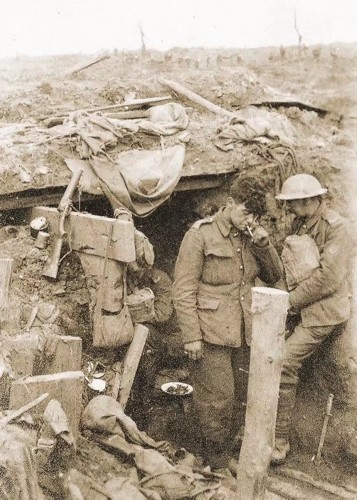 几名澳大利亚士兵正在战壕里休息,右边士兵抱着一挺刘易斯轻机枪。