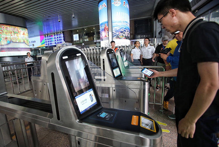 北京西站,乘客刷二维码进站乘坐北京市郊铁路城市副中心线。扫码进站主要分为“进站验脸”和“刷脸入站”两个步骤,整体平均用时约2秒。进站过闸机时,乘客先扫描二维码,后台调取人脸信息。闸机上方的摄像头确认人脸信息与后台一致时,闸门将自动打开。乘客可选择刷市郊铁路一卡通、“亿通行”APP二维码(需进入“市郊铁路”模块申请)、中铁银通卡或购买铁路磁质客票进站乘车。