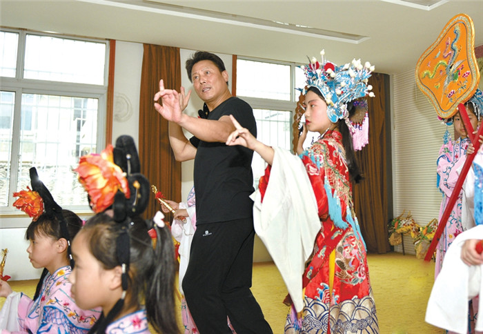 安徽省宣城市绩溪实验小学"徽剧童子班"的学生,在老师的带领下学习徽剧经典曲目《贵妃醉酒》。(图片来源:安徽日报)