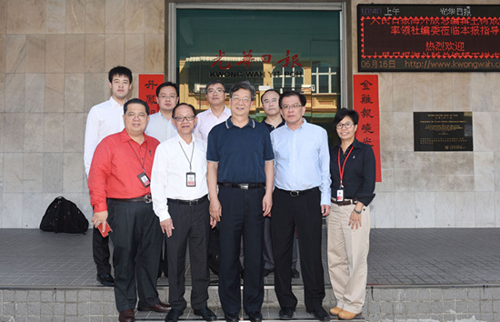 人民日报社编委、海外版总编辑王树成与《光华日报》董事骆南辉(右二)、总经理李兴前(左二)等高管在《光华日报》门前合影