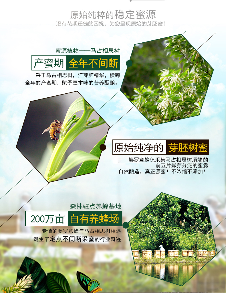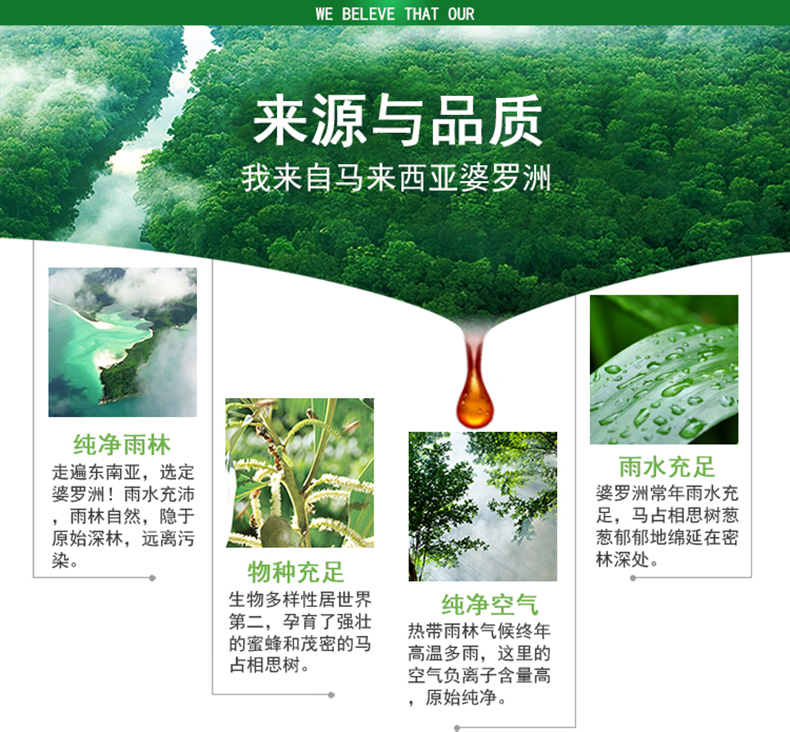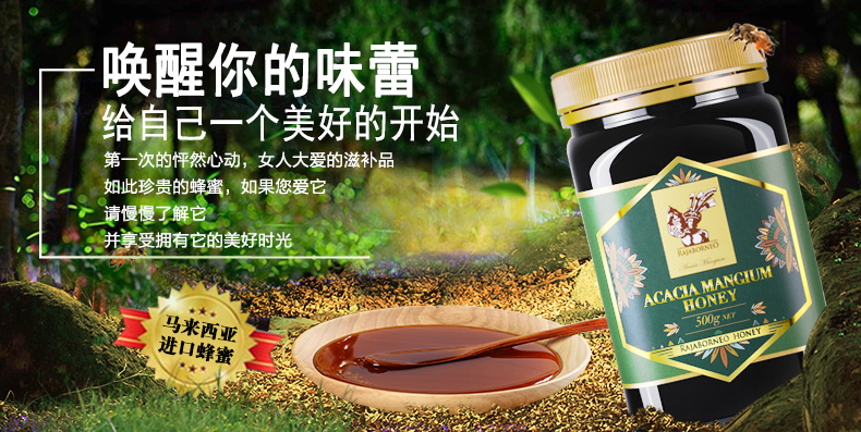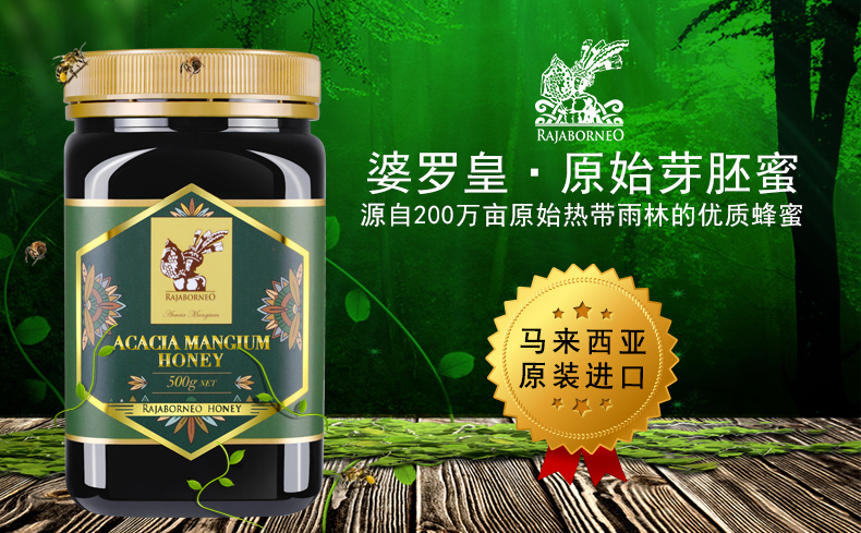 婆罗皇结晶蜜,源自马来婆罗洲200万原始森林,采于马占相思树,横跨全年的产蜜期,赋予更本味的营养酝酿,物种充足,空气纯净,远离污染。