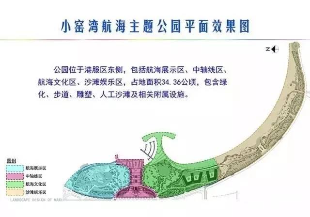 占地34.36万平方米,将由北向南建设航海展示区、中轴线区、航海文化区、沙滩娱乐区四个功能分区。