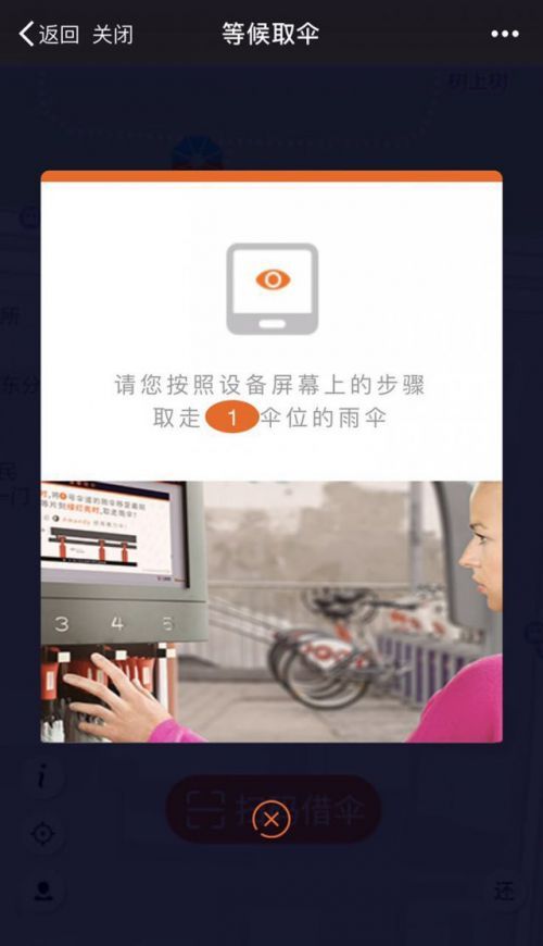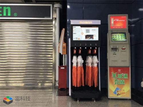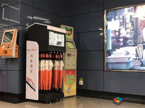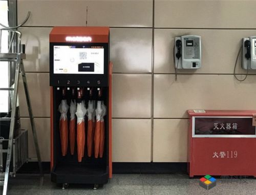 一台橙色(或白色)外壳、体积和自助售货机大小差不多、内部挂着一排雨伞的机器,一眼就可以判定这就是一个用来"借伞"的东西。