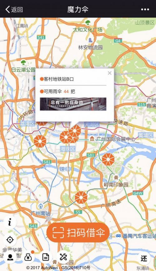 小雷主要来到了广州塔和客村站这两个试点,借伞的"地点"很好找,在广州塔的就位于出闸口的正对面,客村的则位于 B 出口的 711 便利店旁边。