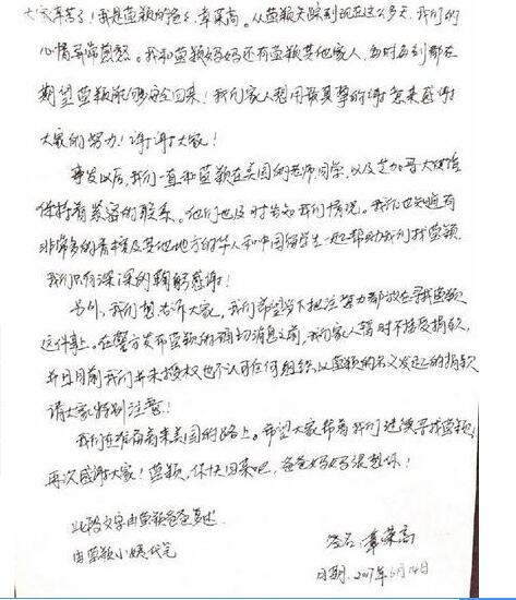 【失踪硕士父亲发声 FBI已介入调查】在书面材料中,章荣高称,女儿失踪这些天内心十分煎熬,每时每刻都在期望莹颖能平安归来,并以最诚挚的谢意感谢大家(在寻找莹颖过程中)的努力。他介绍,事情发生之后,他们一直和女儿在美国的老师、同学以及芝加哥大使馆(领事馆)保持紧密联系,“他们一直及时告知我们情况”。