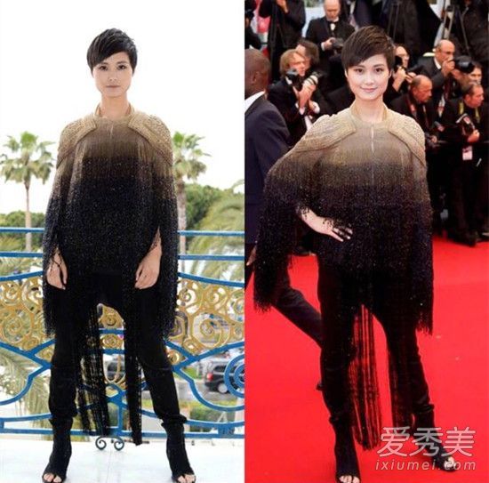 2013年第66届戛纳电影节,穿的是纪梵希2012秋冬高定系列流苏套装,还有一点渐变色设计,还是蛮另类的。