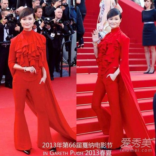 同样还是裤装,但加了大披风,在红毯上瞬间变得显眼起来。