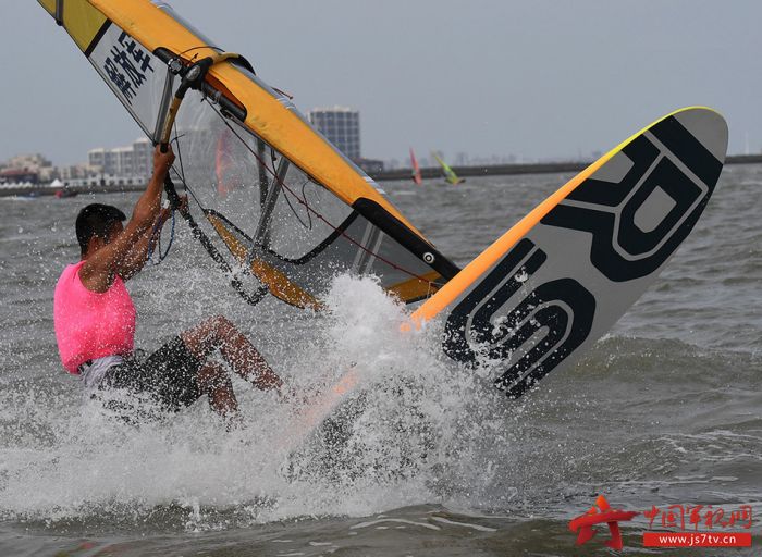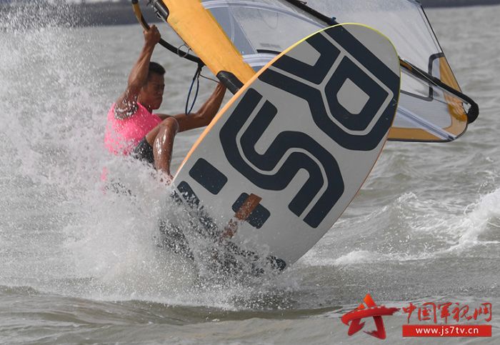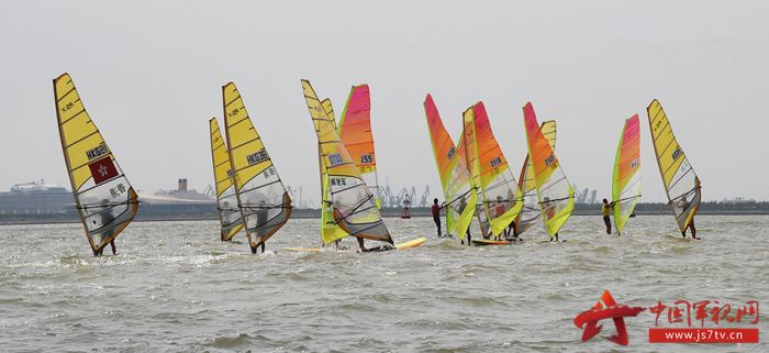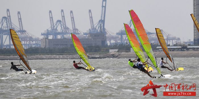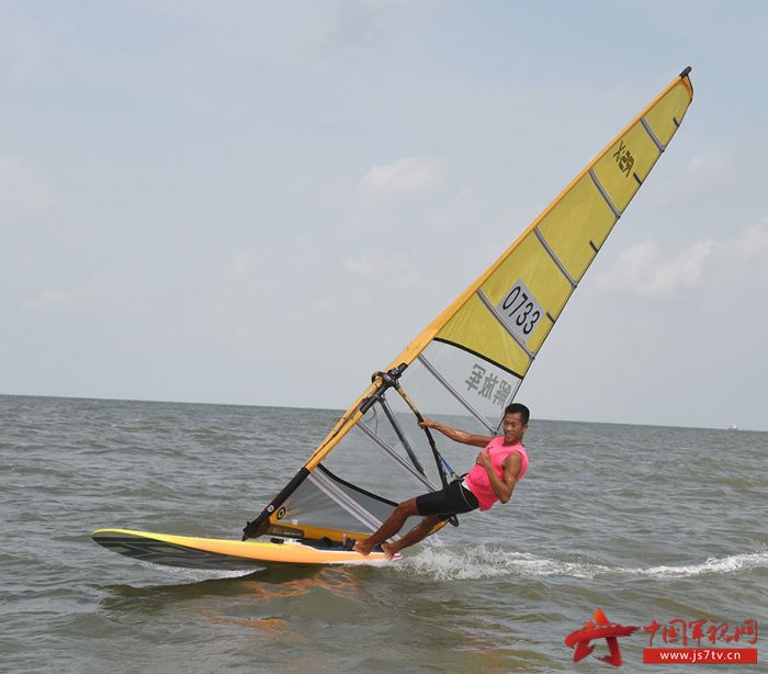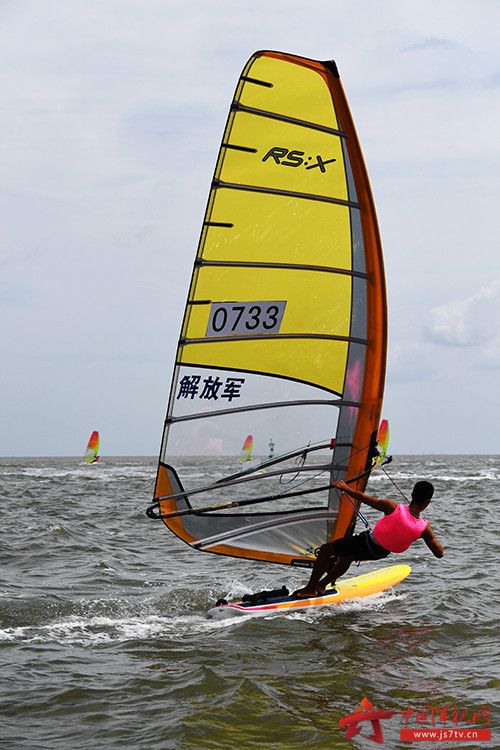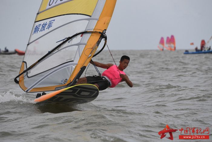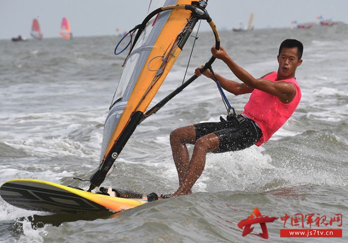 全运会帆船帆板比赛29日继续在天津东疆湾景区展开角逐,在当日进行的男子帆板RS:X级奥林匹克航线赛第三轮的角逐中,解放军队18岁的小将陈昊第三个冲过终点。