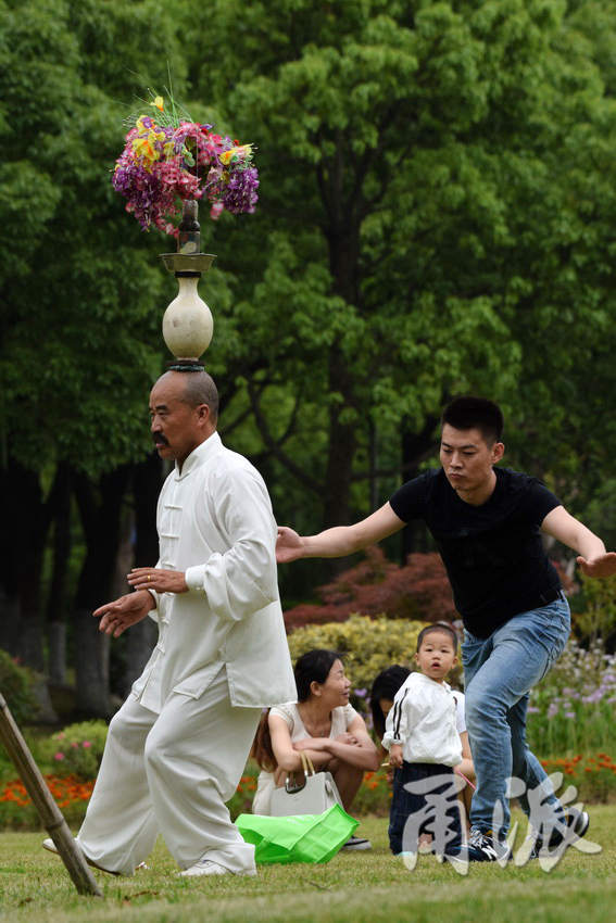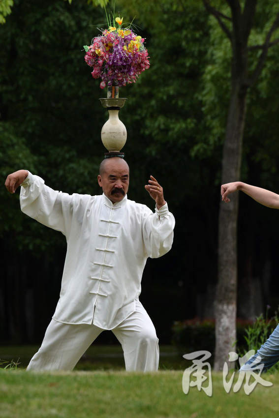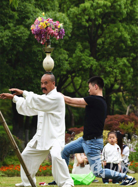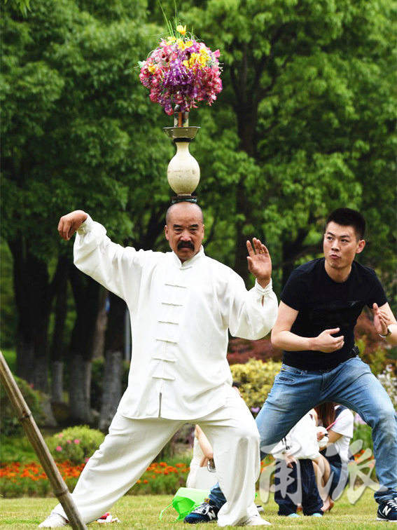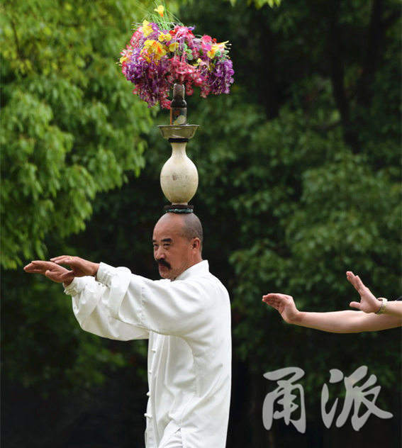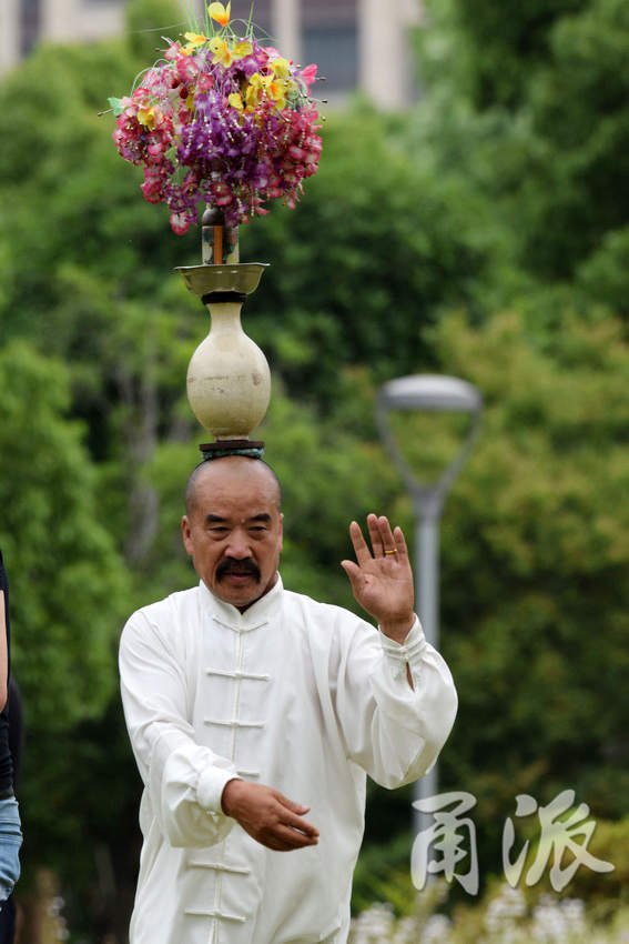 5月23日早晨,在日湖公园见到,晨练队伍中一位老人在绿地上头顶一只大花瓶带徒弟在打太极拳,神情自若,怡然自乐,吸引了许多市民驻足观看。