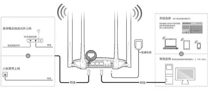 WAN口用来连接光猫或入户网线,LAN口用来连接电脑之类的设备。简单了解路由器的接口之后,再为大家附上一张路由器连接示意图。