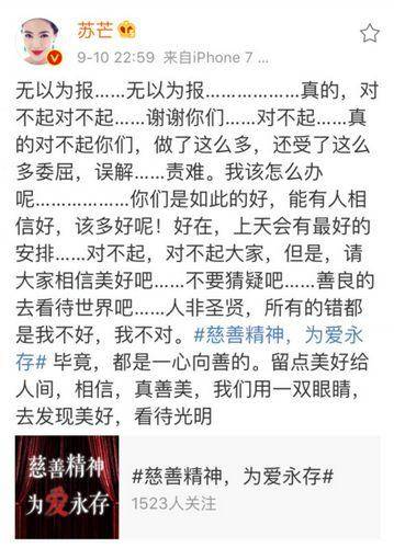苏芒微博全文:无以为报,无以为报....真的,对不起对不起,谢谢你们,对不起,真的对不起你们,做了那么多,还受这么多委屈,误解,责难。我该怎么办呢...你们是如此的好,能有人相信好,该有多好呢! 好在上天会有最好的安排..对不起,对不起大家。但是请大家相信美好吧....不要猜疑吧...善良的去看待世界吧...人非圣贤,所有的错都是我不好,我不对! 毕竟,都是一心向善的。留点美好给人间,相信,真善美,我们用一双眼睛,去发现美好,看待光明。