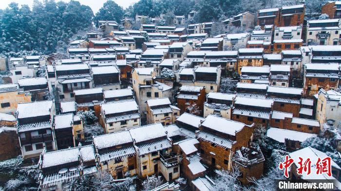 12月14日,受寒潮天气影响,被誉为“中国最美乡村”的江西上饶篁岭古村迎来了2020年的第一场雪。雪中的篁岭古村银装素裹,古村房屋高矮递进、层层而上,白黄相间,渲染得雪中的篁岭景色别有一番风味,构成了一幅绝美山居雪韵图。