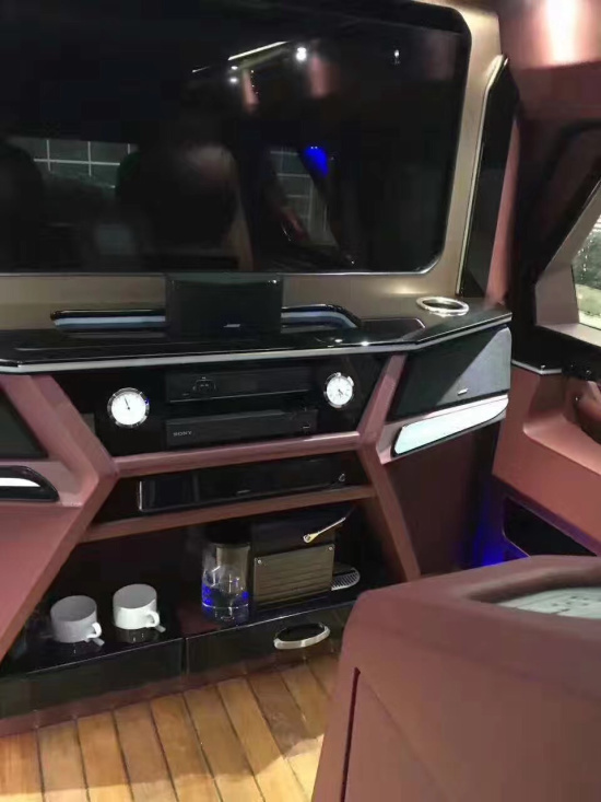 配置:基本配置参数表车体外部车体内部颜色风格车体颜色亚光黑/亚光绿(选装:装甲漆)内饰色调贵族红/皇家米车顶探照灯4个车体内部结构电动天窗2个通体式设计吸顶式升降15寸显示器外接电源中心2套整车座椅数 6座备用胎1个驾驶区主要配置脚踏板2个驾驶室车顶高级鹿皮拖钩拖挂能力5000磅地板原厂豪华地毯轮胎 – 前轮38/15•50R20LT中央扶手马鞍式设计带隐藏式储物箱轮胎 – 后轮38/15•50R20LT乘客区主要配置车身尺寸结构中排座椅带加热、按摩及腿部支撑电动多向座椅车长(mm)5900后排座椅可变沙发床多功能座椅(中间带扶手)车宽(mm)2470车顶高级鹿皮及乔治巴顿标志车高(mm)2490地板全舱柚木地板轴距(mm)3580吧台多功能半隔断组合式设计总质量(kg)3500电气设备控制集成触摸控制系统动力和悬挂空调系统独立控制。