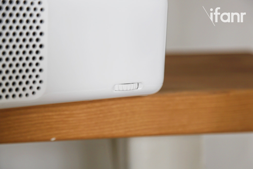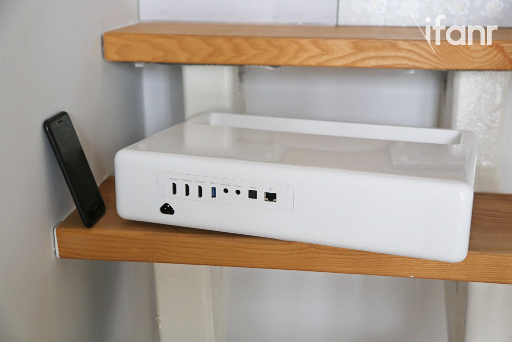 熟悉小米智能家居的人一定不会对米家激光影院的外观感到陌生,素雅的黑白搭配,加上规整的长方形设计,不张扬也比较百搭,机身整体是塑料制成,跟旁边的 iPhone 7 比较,会发现它体积其实不小。