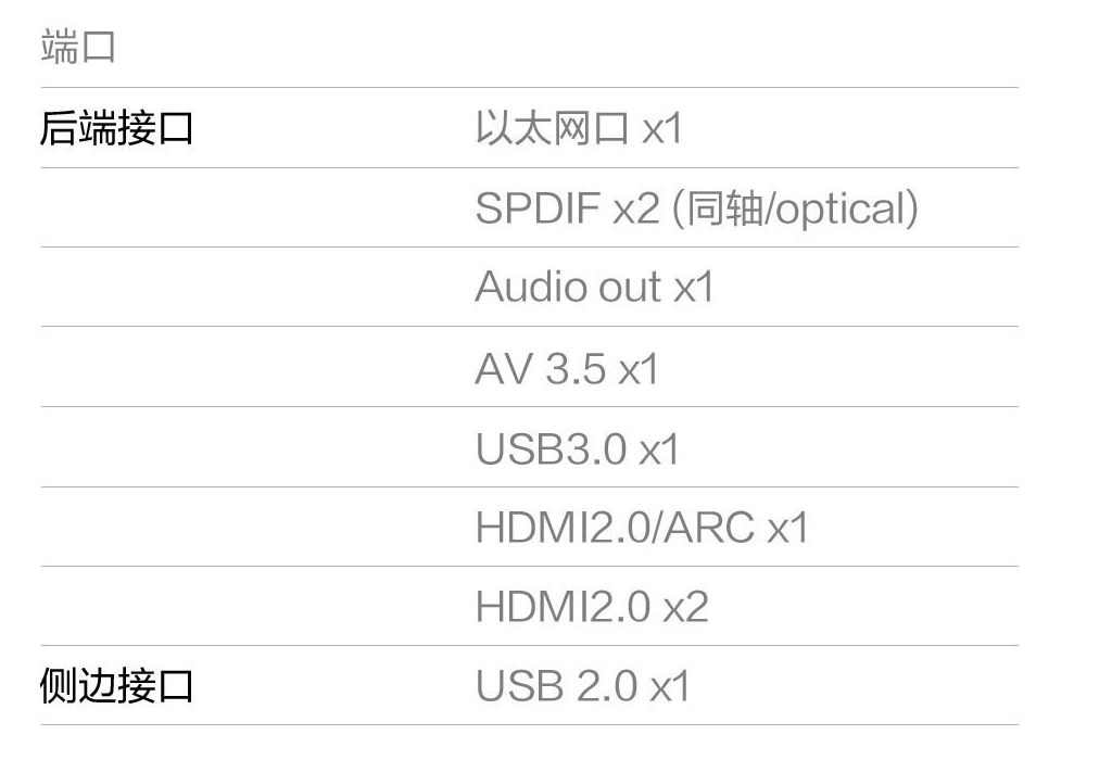 整体提供的接口同小米电视一脉相承,三个 HDMI 接口足够接驳 IPTV、游戏机和电脑三个设备,网络接口、音频口等也可以满足更为高阶用户的需求,在机身背部和侧面,各提供了一个 USB 接口,如果有客人来访,可以直接把 U 盘或者手机接...