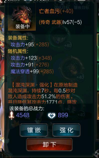 武器方面我们也选择从小丑赌出高级遗忘之恨,这个武器的主动效果可以主动提升攻击力,傀儡的召唤物攻击力是在召唤的时候判定的,也就是说混沌深渊期间召唤出的所有召唤物在下次召唤出来之前都继承混沌深渊提供的攻击力,在目前本体七千攻击力的情况下,遗忘之恨为我们带来的这一千七百多攻击力其实是非常非常可观的,另外我们也可以选择世界掉落的亡者血污,也是非常给力的。