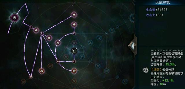 出门走生命,向下点出爆发灵魂,这个天赋是傀儡boss战中最好的回复灵魂的手段,点出爆发灵魂之后点出幽灵蜥和幽灵狼,然后补出制造精通,这个天赋可以让全队包括你的宝宝在击杀的时候有几率获得额外的灵魂,然后走下面的生命路线向左上点出傀儡光环,最后补死忠亡灵和幽灵同化