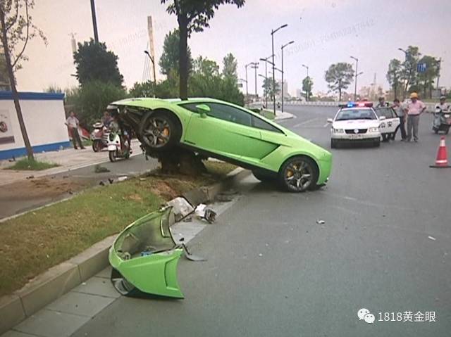 这辆绿色的兰博基尼,车头直接冲上路边绿化带,爬上了绿化带中的树丛,车头部分零部件散落一地,车的保险杠整个脱落,右后轮轮毂和右侧车门都有严重损坏。