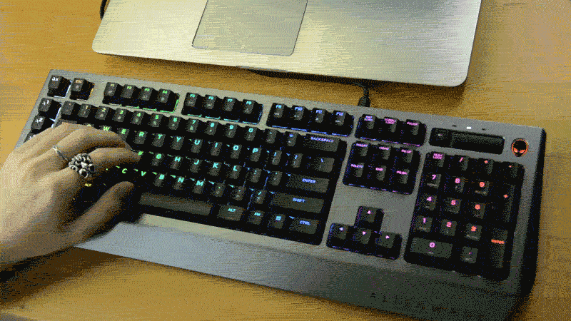 不过为了好看,我还是随意设置了一套彩虹配色(你骗人,明明预设就是彩虹色),看起来其实真的感觉算蛮不错的,掌托下面的一排氛围灯能在灯光昏暗的情况下显得格外酷炫,就像改装车地盘上加装的一圈霓虹灯效果,高大上。
