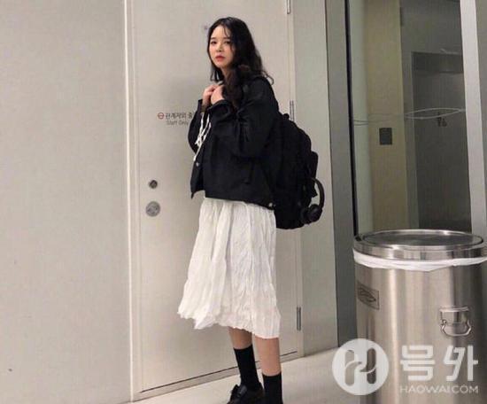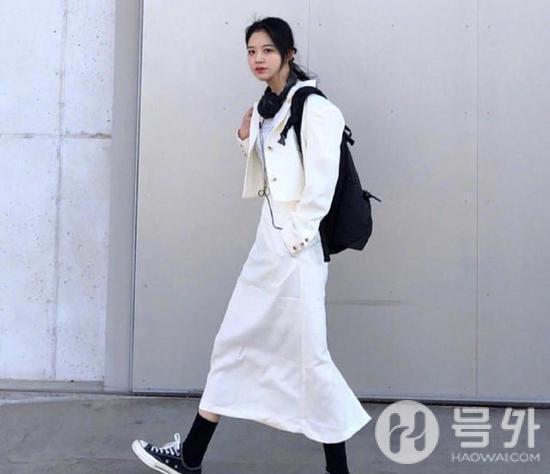 白色元素单品的叠穿调配非常吸人眼球,一袭白色连衣裙,外面调配白色外套,看起来非常轻盈清新。调配黑色中筒袜和黑色板鞋,背黑色双肩包,给人一种休闲时尚之感。