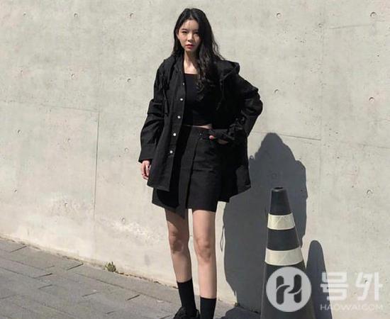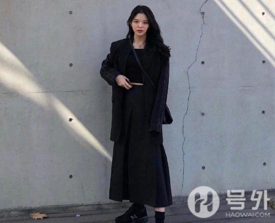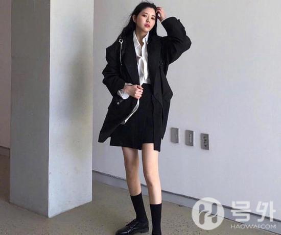 一身黑的叠穿混搭让你看起来既酷帅十足,又非常具有气质美。黑色外套,配黑色短裙,里边调配白色衬衫,使全体调配在调和中递进,显示高雅气质美。下面配黑色中筒袜和黑色皮鞋,显露细长美腿,更显完美好身材。