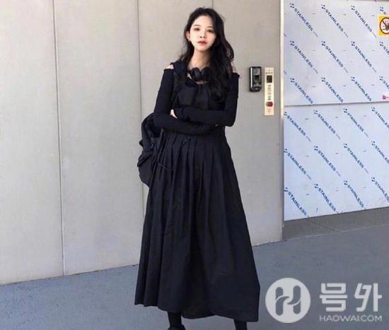 黑色连衣裙也是许多小仙女们的独爱。收腰大摆压褶规划,色彩素雅精约。里边调配黑色长袖T恤,温婉大方。大裙摆流通的线条与微卷的长发彼此照应,显示自在不羁、休闲新潮的气质美。